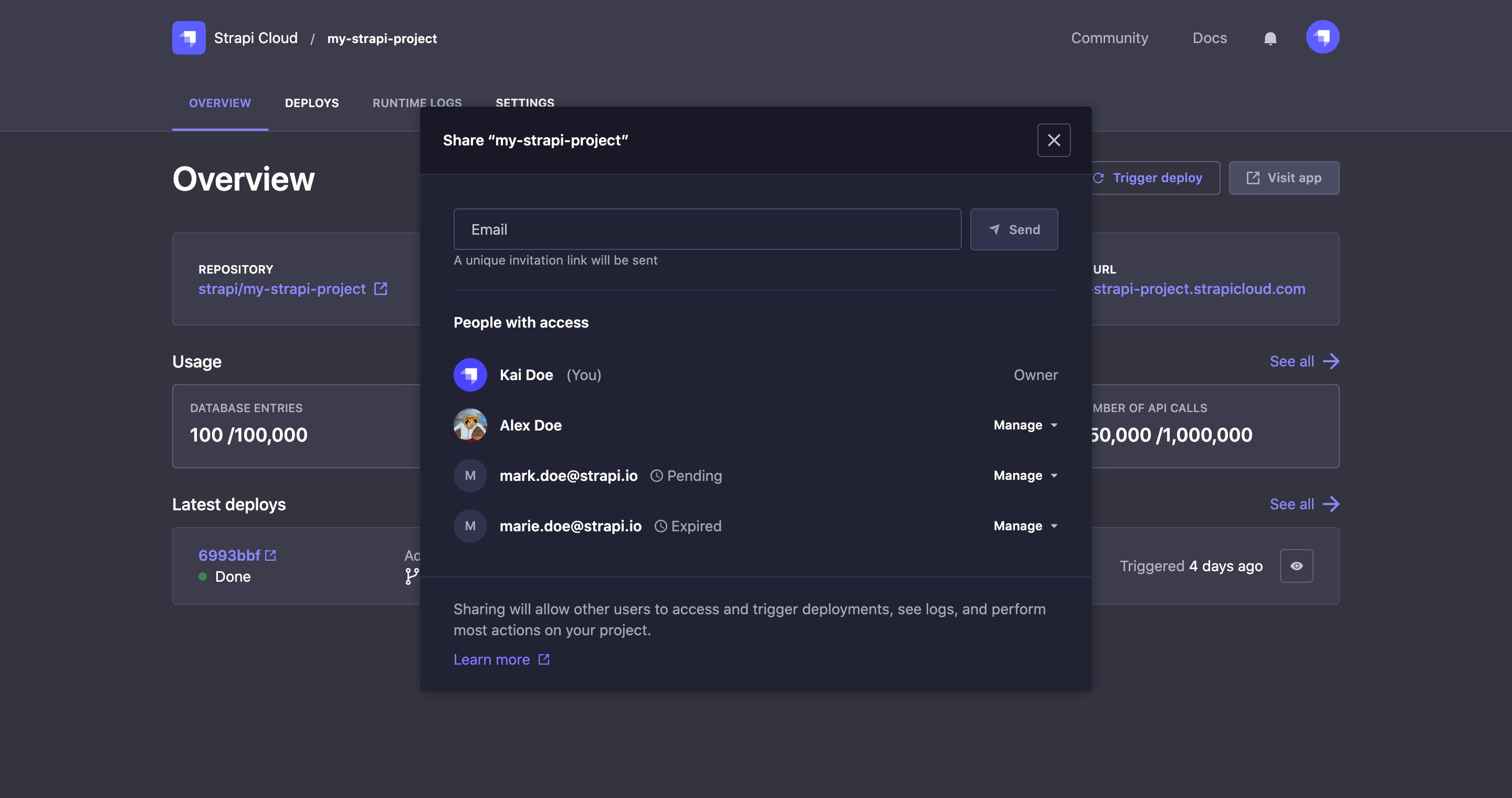 Projects are created by a user via their Strapi Cloud account. Strapi Cloud users can share their projects to anyone else, so these new users can have access to the Cloud dashboard and collaborate on that project, without the project owner to ever have to share their credentials.